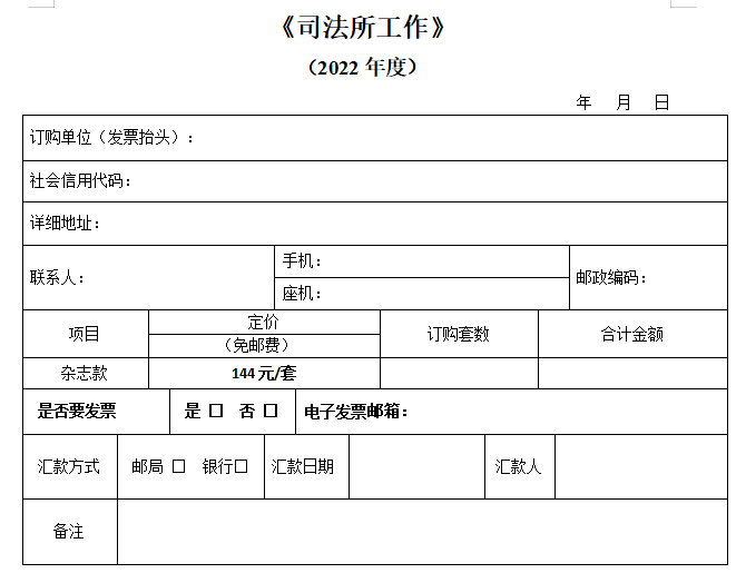 單位匯款時(shí)請(qǐng)務(wù)必標(biāo)明“司法所工作+訂購(gòu)套數(shù)”,個(gè)人匯款請(qǐng)務(wù)必注明“單位名稱(chēng)+中國(guó)司法”。