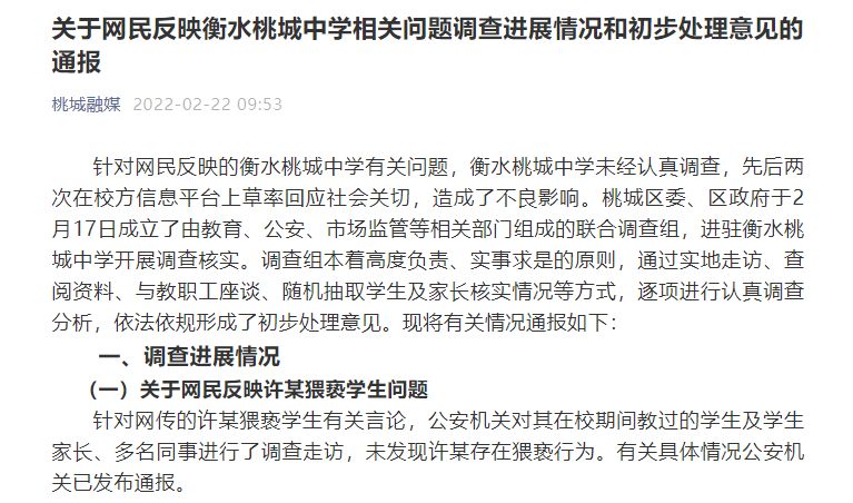 關(guān)于網(wǎng)民反映衡水桃城中學(xué)相關(guān)問(wèn)題調(diào)查進(jìn)展情況和初步處理意見(jiàn)的通報(bào)