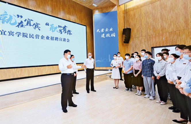 2022年6月8日,中共中央總書記、國家主席、中央軍委主席習(xí)近平在四川考察。這是8日下午,習(xí)近平在宜賓學(xué)院考察時(shí),向正在參加企業(yè)招聘宣講會(huì)的教師、學(xué)生、企業(yè)負(fù)責(zé)人了解企業(yè)招工需求和畢業(yè)生簽約率等情況。 新華社記者 李學(xué)仁/攝