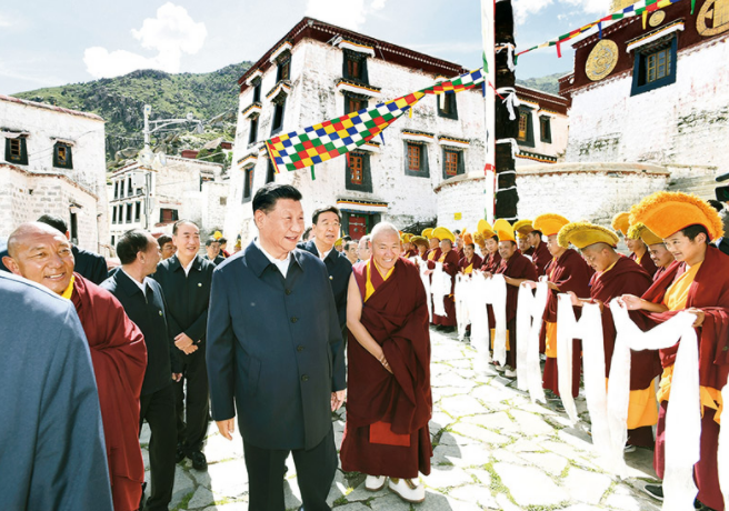2021年7月21日至23日,中共中央總書記、國家主席、中央軍委主席習(xí)近平來到西藏,祝賀西藏和平解放70周年,看望慰問西藏各族干部群眾。這是22日下午,習(xí)近平在位于拉薩西郊的哲蚌寺考察。 新華社記者 謝環(huán)馳/攝