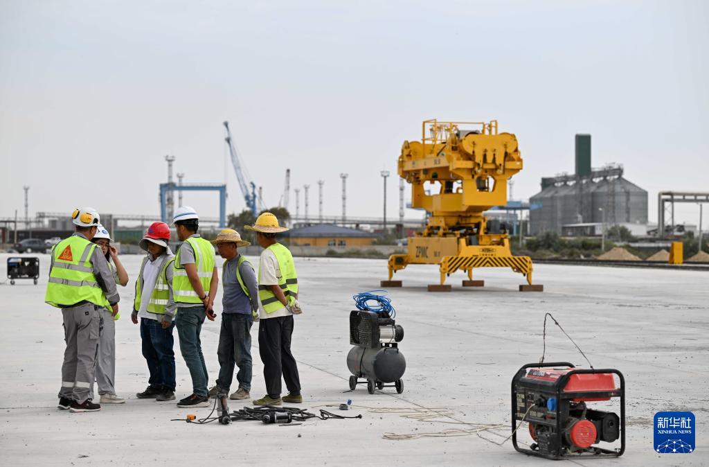 8月5日,工人在哈薩克斯坦阿克套港集裝箱樞紐一期工程工作。新華社記者 李任滋 攝