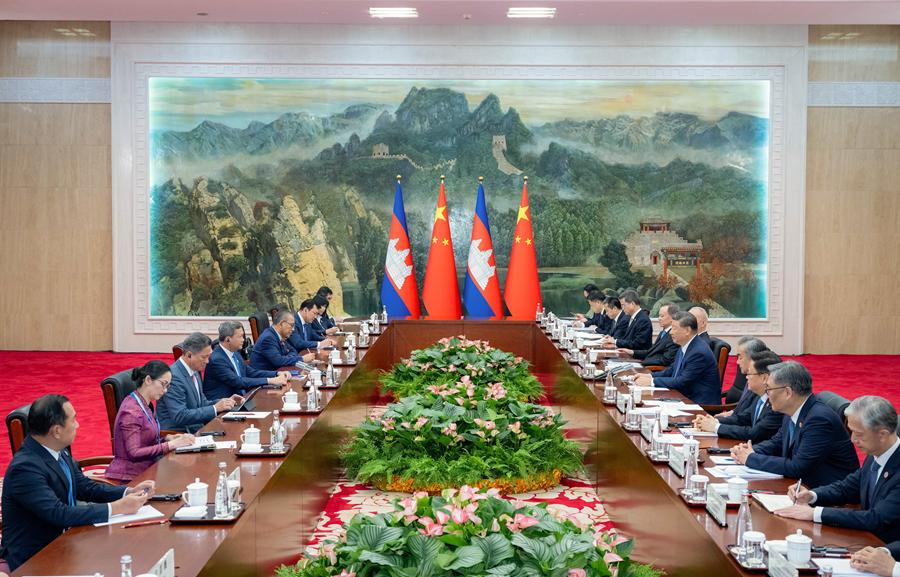 8月30日下午,國家主席習近平在天津迎賓館會見來華出席2025年上海合作組織峰會的柬埔寨首相洪瑪奈。新華社記者 翟健嵐 攝