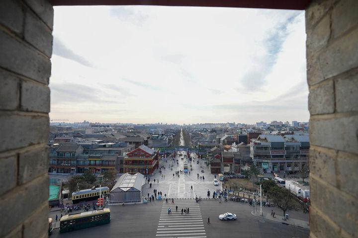 2024年12月26日,從正陽門箭樓內(nèi)向南拍攝的北京前門大街和遠處的永定門城樓。新華社記者 鞠煥宗 攝