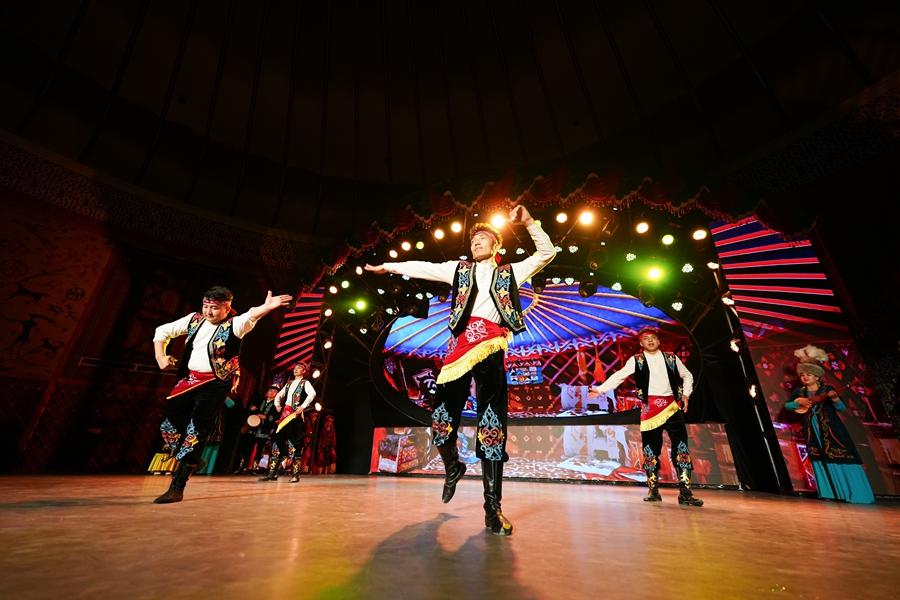 演員在位于新疆阿圖什市的瑪納斯史詩(shī)大劇院為游客演繹《瑪納斯》(2025年4月22日攝)。新華社記者 徐宏巖 攝