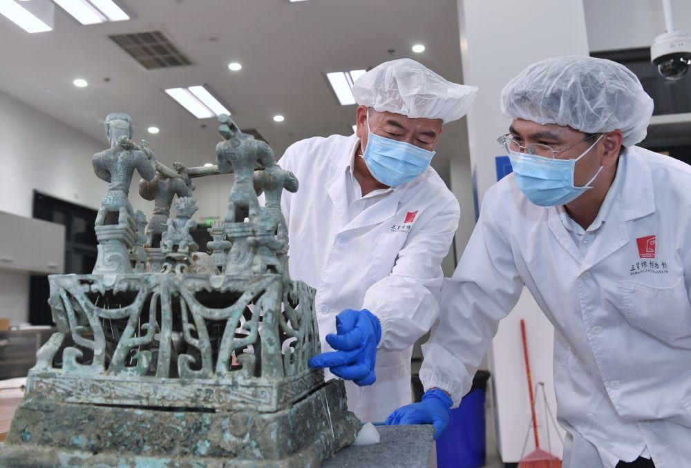 2023年5月30日,在四川三星堆博物館文物保護和修復(fù)中心,文物修復(fù)師郭漢中(左)與同事討論神壇底座修復(fù)方案。郭漢中從事文物修復(fù)工作已40余年,深度參與了三星堆祭祀坑的發(fā)掘工作,累計修復(fù)文物6000余件?!按蟾胚€有上萬件文物等著修復(fù),需要一代接著一代往下干?!惫鶟h中說,他要把平生所學(xué)傳承下去,培養(yǎng)更多人才。