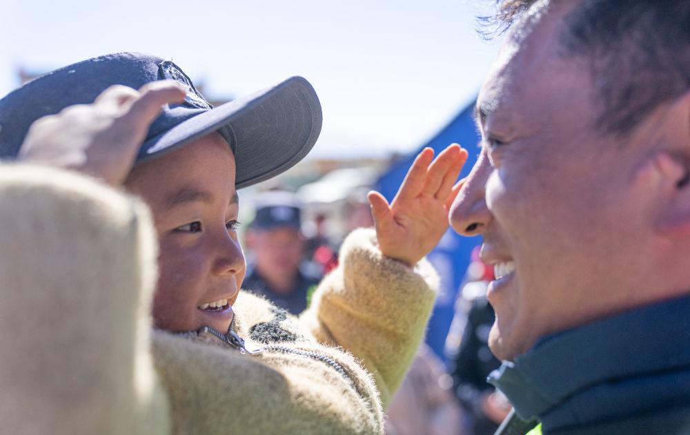 2025年1月14日,在受到地震波及的西藏定日縣長(zhǎng)所鄉(xiāng)嘎布村,一名小朋友戴上了參加抗震救災(zāi)工作的移民警察米瑪次仁的帽子,向他敬禮。新華社記者 丁增尼達(dá) 攝