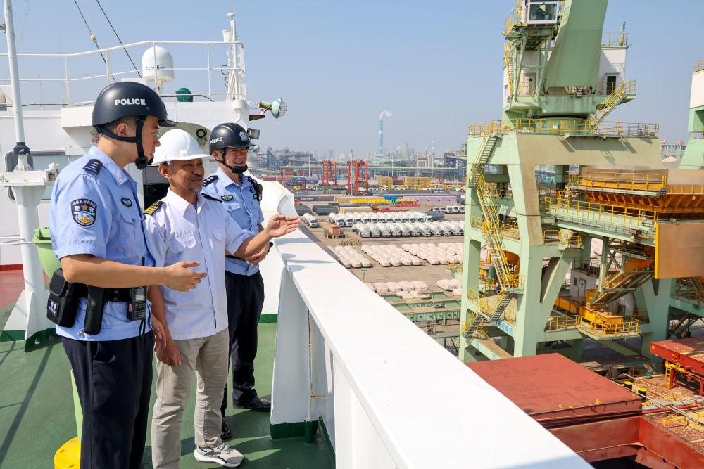 2025年10月1日,在山東港口日照港,日照出入境邊防檢查站民警登上外輪與外籍船長(zhǎng)(中)交流。新華社記者 郭緒雷 攝
