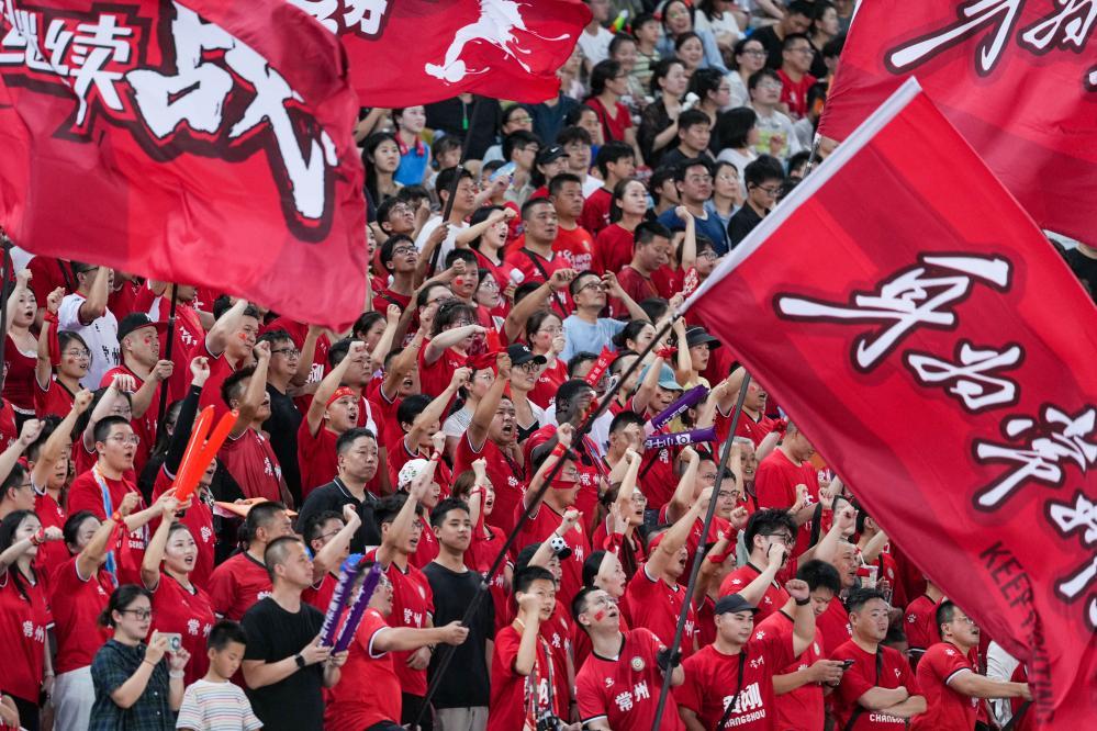 2025年7月20日,2025江蘇省城市足球聯(lián)賽第七輪比賽中,常州隊(duì)球迷在場(chǎng)邊加油。新華社記者 李博 攝