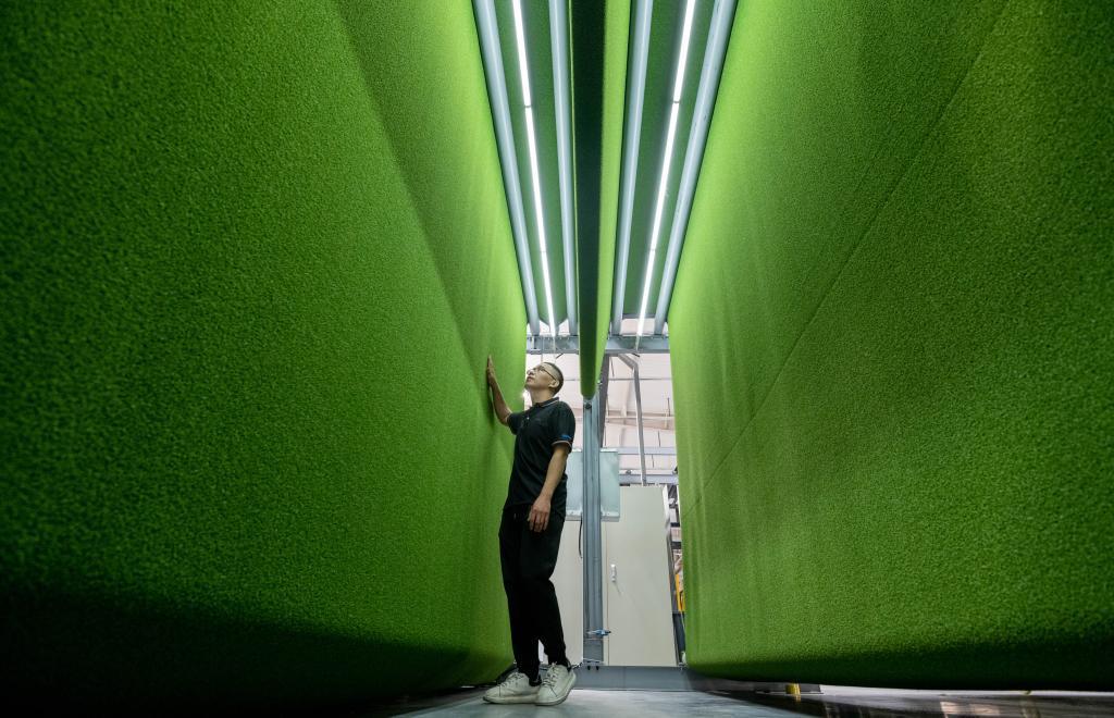 在山東省樂陵市泰山體育產(chǎn)業(yè)集團(tuán)人造草坪智能化生產(chǎn)車間,工人在檢測(cè)產(chǎn)品。新華社記者 范長國 攝