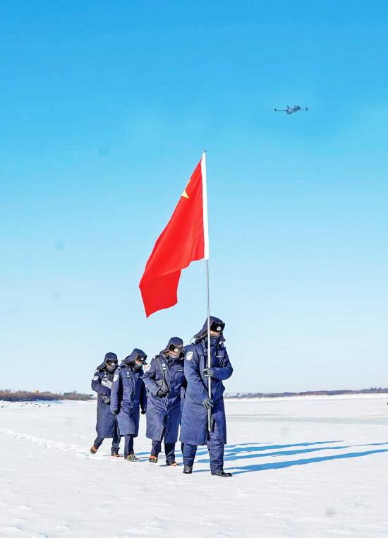 圖為烏蘇鎮(zhèn)邊境派出所民警在封凍的烏蘇里江面上執(zhí)行巡邊任務(wù)。