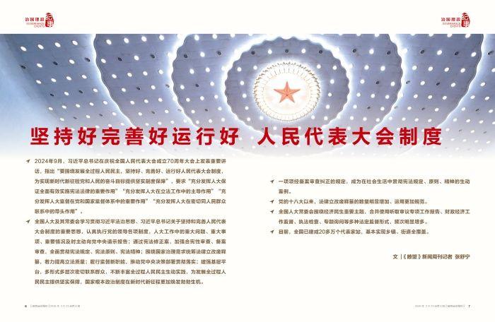 ◇2024年9月,習(xí)近平總書(shū)記在慶祝全國(guó)人民代表大會(huì)成立70周年大會(huì)上發(fā)表重要講話,指出“要圍繞發(fā)展全過(guò)程人民民主,堅(jiān)持好、完善好、運(yùn)行好人民代表大會(huì)制度,為實(shí)現(xiàn)新時(shí)代新征程黨和人民的奮斗目標(biāo)提供堅(jiān)實(shí)制度保障”,要求“充分發(fā)揮人大保證全面有效實(shí)施憲法法律的重要作用”“充分發(fā)揮人大在立法工作中的主導(dǎo)作用”“充分發(fā)揮人大監(jiān)督在黨和國(guó)家監(jiān)督體系中的重要作用”“充分發(fā)揮人大在密切同人民群眾聯(lián)系中的帶頭作用”。