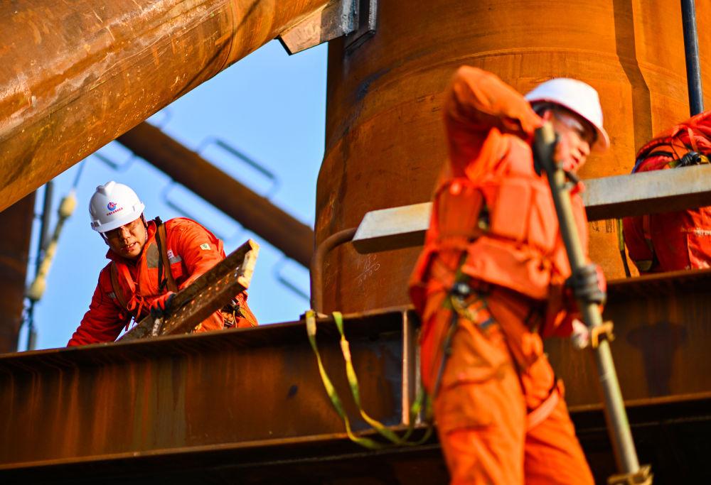 2026年2月13日,工人在位于渤海中部海域的渤中26-6油田開發(fā)項目(二期)作業(yè)現(xiàn)場施工。新華社記者 趙子碩 攝