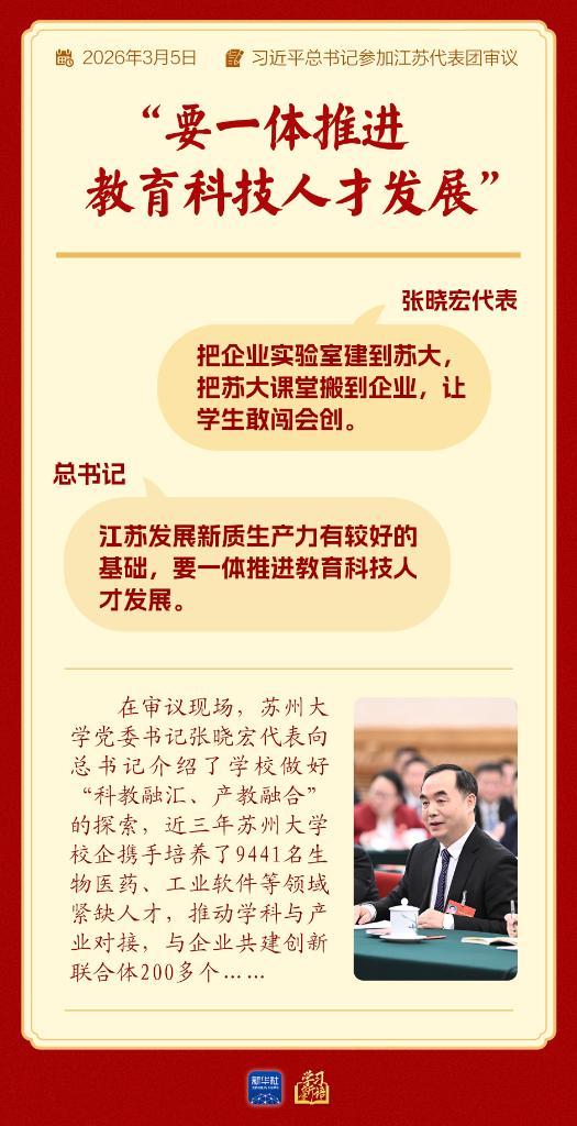 張曉宏代表來自蘇州大學(xué),向總書記介紹了學(xué)校推進(jìn)“科教融匯、產(chǎn)教融合”的探索:“把企業(yè)實(shí)驗(yàn)室建到蘇大,把蘇大課堂搬到企業(yè),讓學(xué)生敢闖會(huì)創(chuàng)。”近三年校企攜手培養(yǎng)了9441名生物醫(yī)藥、工業(yè)軟件等領(lǐng)域緊缺人才,推動(dòng)學(xué)科與產(chǎn)業(yè)對(duì)接,與企業(yè)共建創(chuàng)新聯(lián)合體200多個(gè)……