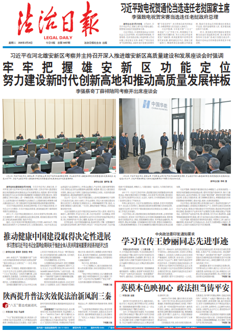 英雄是時(shí)代的標(biāo)桿,榜樣是前行的力量。王妙麗以無畏之勇護(hù)民安,以赤誠(chéng)之心守初心,以堅(jiān)守之行擔(dān)使命,充分展現(xiàn)了新時(shí)代政法干警忠誠(chéng)干凈擔(dān)當(dāng)?shù)牧己蔑L(fēng)貌。