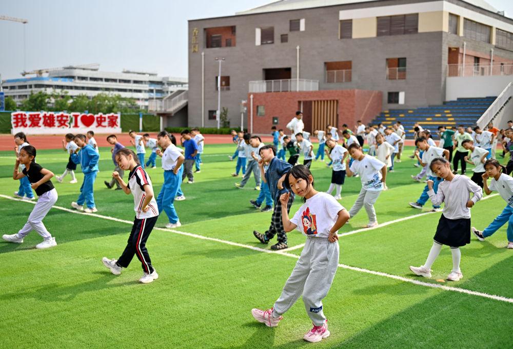 2024年5月21日,雄安史家胡同小學(xué)學(xué)生在操場(chǎng)上做操。按照統(tǒng)一安排,北京四中、北京史家胡同小學(xué)、北京北海幼兒園等知名校(園)長(zhǎng)在雄安新區(qū)設(shè)立領(lǐng)航名校長(zhǎng)工作室,推動(dòng)優(yōu)質(zhì)中小學(xué)基礎(chǔ)教育資源同雄安實(shí)現(xiàn)共享。