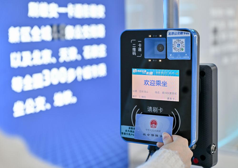 2026年3月17日,雄安一卡通體驗(yàn)館的工作人員演示刷社保卡乘坐公交車(chē)。