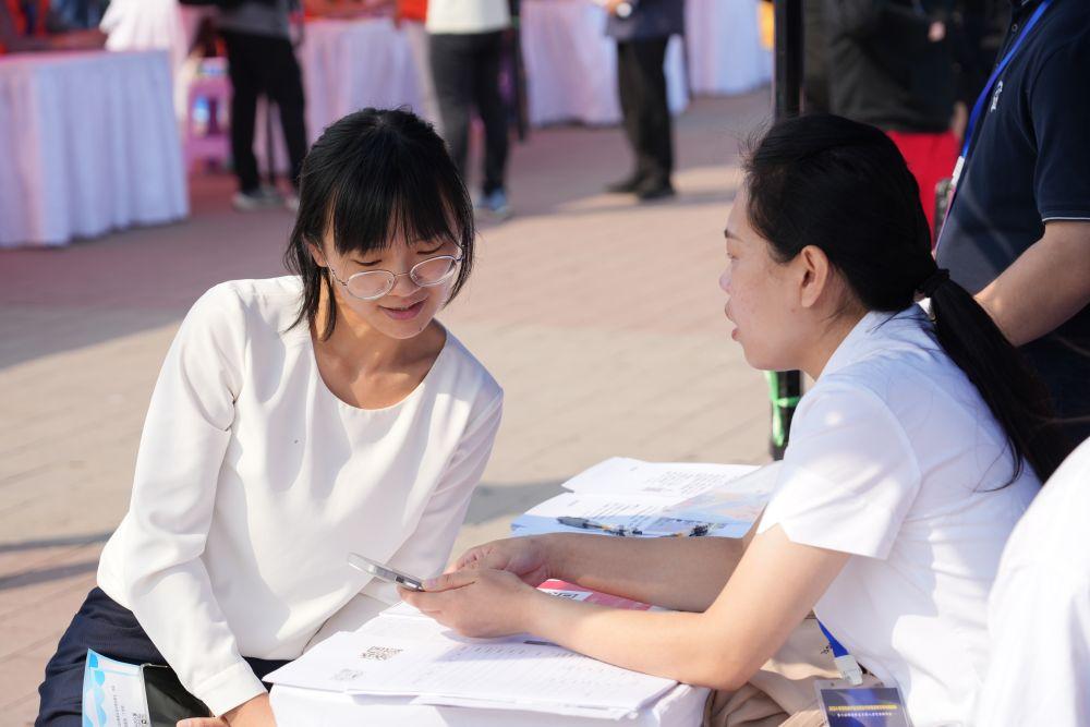 2024年9月25日,求職者(左)在招聘會(huì)現(xiàn)場(chǎng)與招聘單位工作人員交流。當(dāng)日,雄安新區(qū)舉辦2024年河北省畢業(yè)生就業(yè)市場(chǎng)雄安新區(qū)專(zhuān)場(chǎng)招聘會(huì)暨河北雄安新區(qū)大型人力資源招聘會(huì)。招聘會(huì)以“穩(wěn)崗就業(yè) 聚才發(fā)展”為主題,邀請(qǐng)京津冀地區(qū)共157家企業(yè)線下參會(huì),提供就業(yè)崗位4783個(gè)。