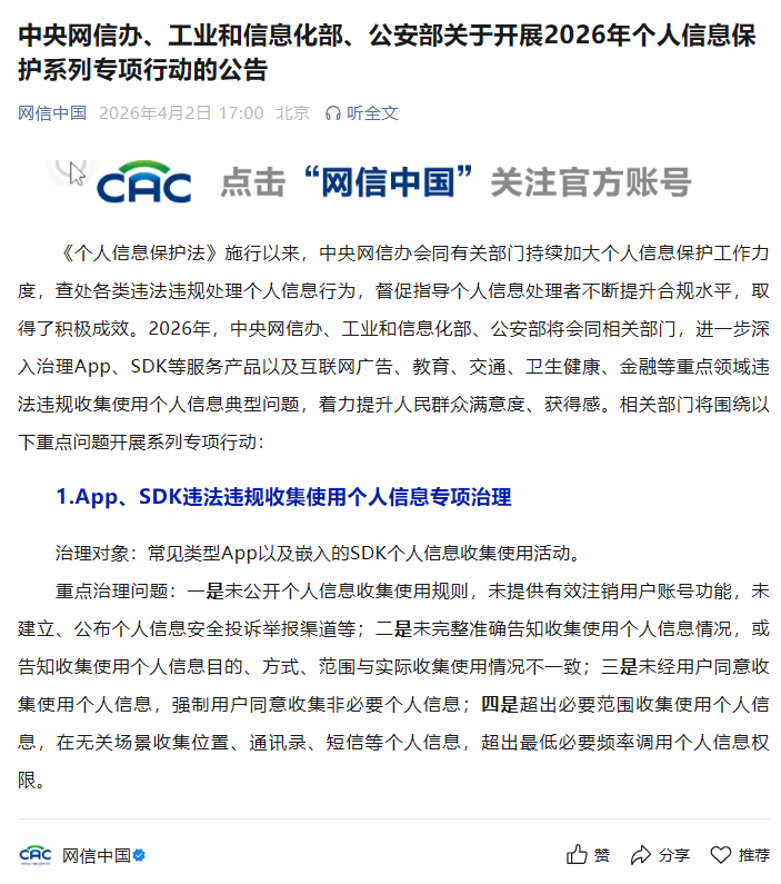 《個(gè)人信息保護(hù)法》施行以來(lái),中央網(wǎng)信辦會(huì)同有關(guān)部門持續(xù)加大個(gè)人信息保護(hù)工作力度,查處各類違法違規(guī)處理個(gè)人信息行為,督促指導(dǎo)個(gè)人信息處理者不斷提升合規(guī)水平,取得了積極成效。2026年,中央網(wǎng)信辦、工業(yè)和信息化部、公安部將會(huì)同相關(guān)部門,進(jìn)一步深入治理App、SDK等服務(wù)產(chǎn)品以及互聯(lián)網(wǎng)廣告、教育、交通、衛(wèi)生健康、金融等重點(diǎn)領(lǐng)域違法違規(guī)收集使用個(gè)人信息典型問(wèn)題,著力提升人民群眾滿意度、獲得感。相關(guān)部門將圍繞以下重點(diǎn)問(wèn)題開展系列專項(xiàng)行動(dòng):