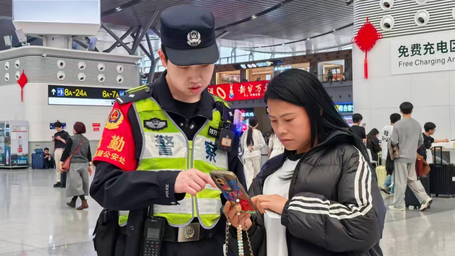 圖為長(zhǎng)沙南站民警幫助旅客。