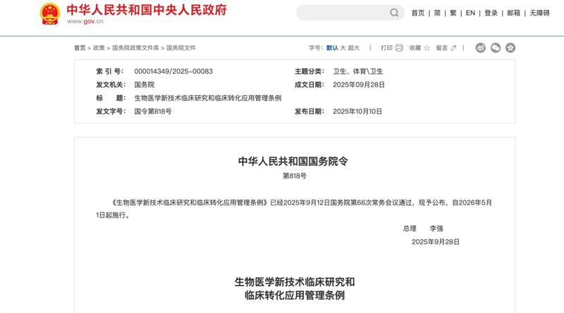 我國首部專門規(guī)范生物醫(yī)學新技術臨床研究的行政法規(guī)《生物醫(yī)學新技術臨床研究和臨床轉化應用管理條例》(國務院令第818號,簡稱“818號令”)(以下簡稱《條例》)將于2026年5月1日正式施行。新規(guī)明確禁止在臨床研究階段以任何形式向受試者收取費用,并首次將醫(yī)療機構及醫(yī)務人員列為直接責任主體,標志著干細胞、免疫細胞等前沿療法告別“灰色操作”,全面進入依法監(jiān)管新階段。