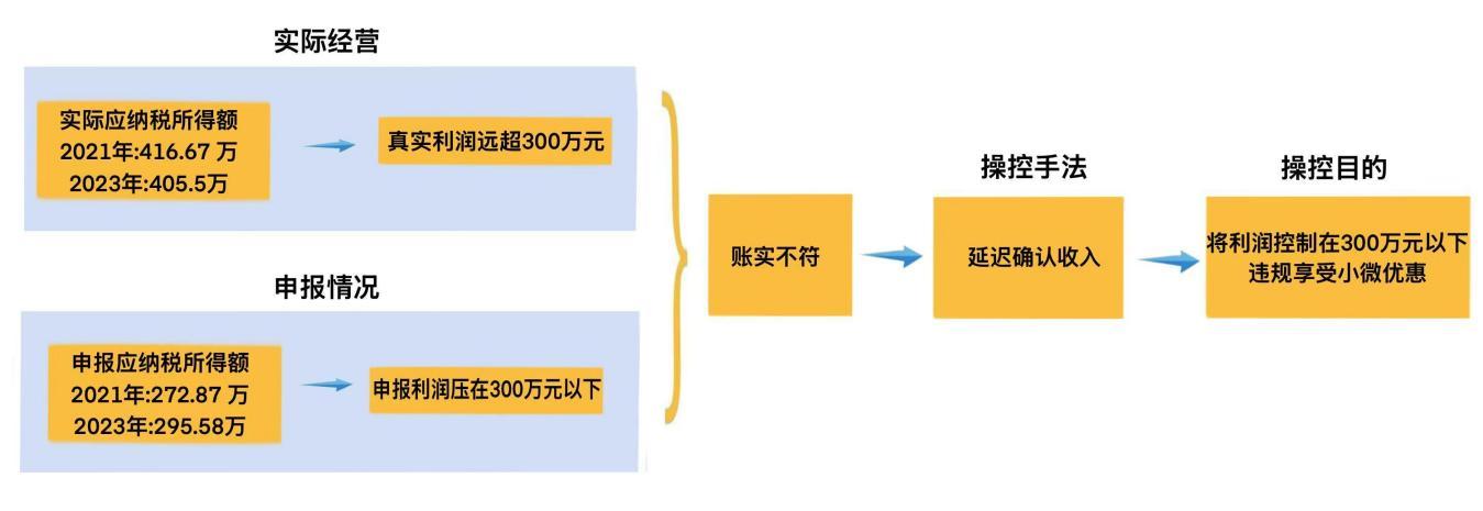 經核實,2021年該駕校合同載明收入及銀行流水測算的應納稅所得額為416.67萬元,申報為272.87萬元;2023年實際為405.5萬元,申報數(shù)為295.58萬元。企業(yè)刻意將應納稅所得額控制在300萬元小型微利企業(yè)標準線以下,違規(guī)享受小微企業(yè)稅收優(yōu)惠政策。