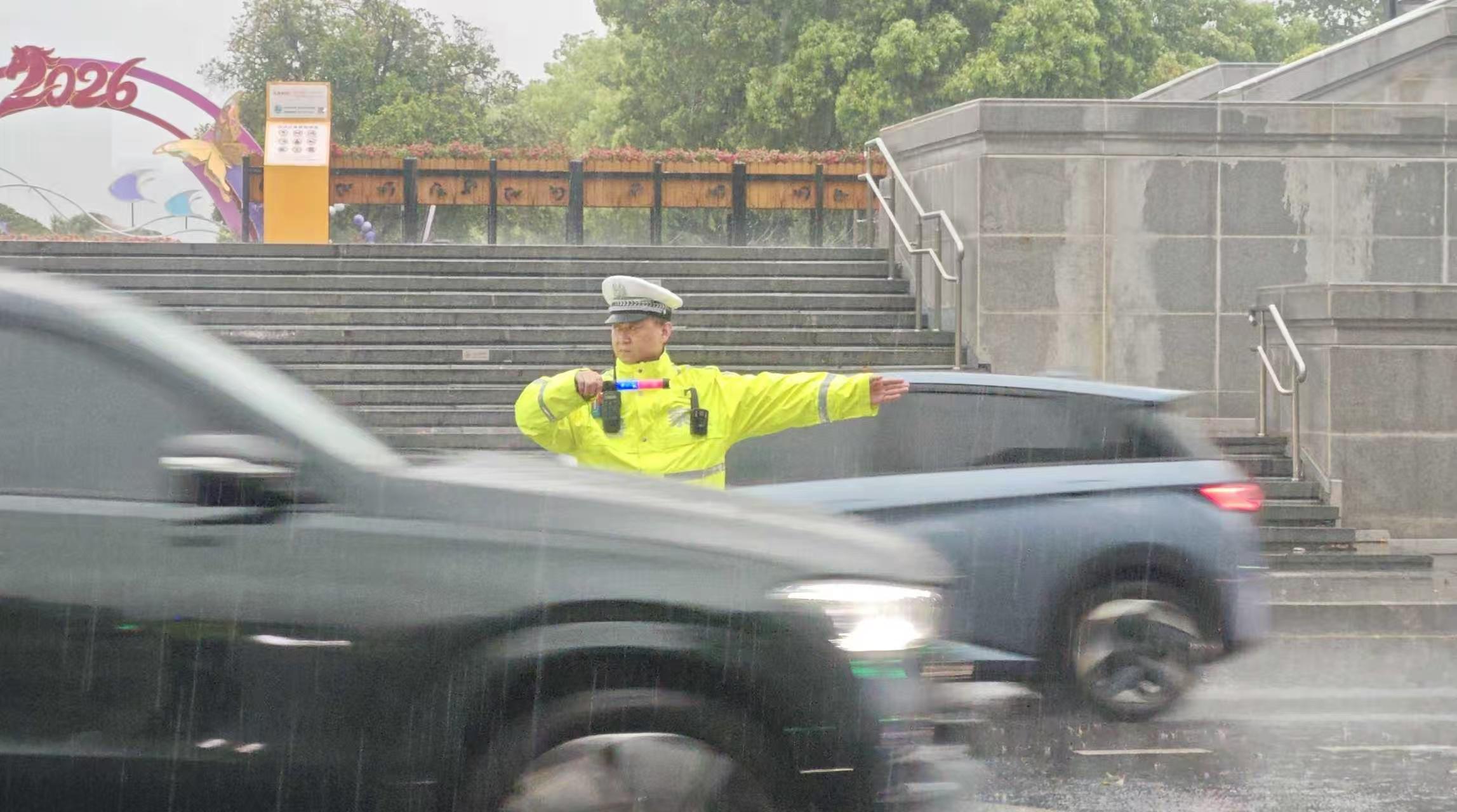 圖為武漢市公安局江岸區(qū)分局交通管理大隊民警在暴雨中指揮交通。