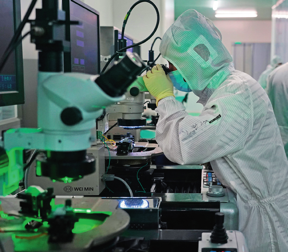 在位于江西省南昌市的南昌大學(xué)國(guó)家硅基LED工程技術(shù)研究中心,技術(shù)人員正在對(duì)芯片進(jìn)行電性測(cè)試(2024年4月3日攝)。萬(wàn)象攝/本刊