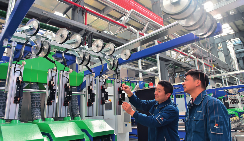 在江西江銅華東電工新材料科技有限公司生產(chǎn)車(chē)間,技術(shù)工人在生產(chǎn)線上巡檢設(shè)備(資料照片)。張善臣攝/本刊