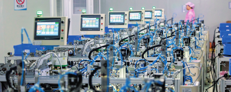 在江西贛州訊康電子科技有限公司,工作人員從T1—T2全自動(dòng)穿環(huán)機(jī)旁走過(guò),該機(jī)器生產(chǎn)磁性元器件(資料照片)。才揚(yáng)攝/本刊