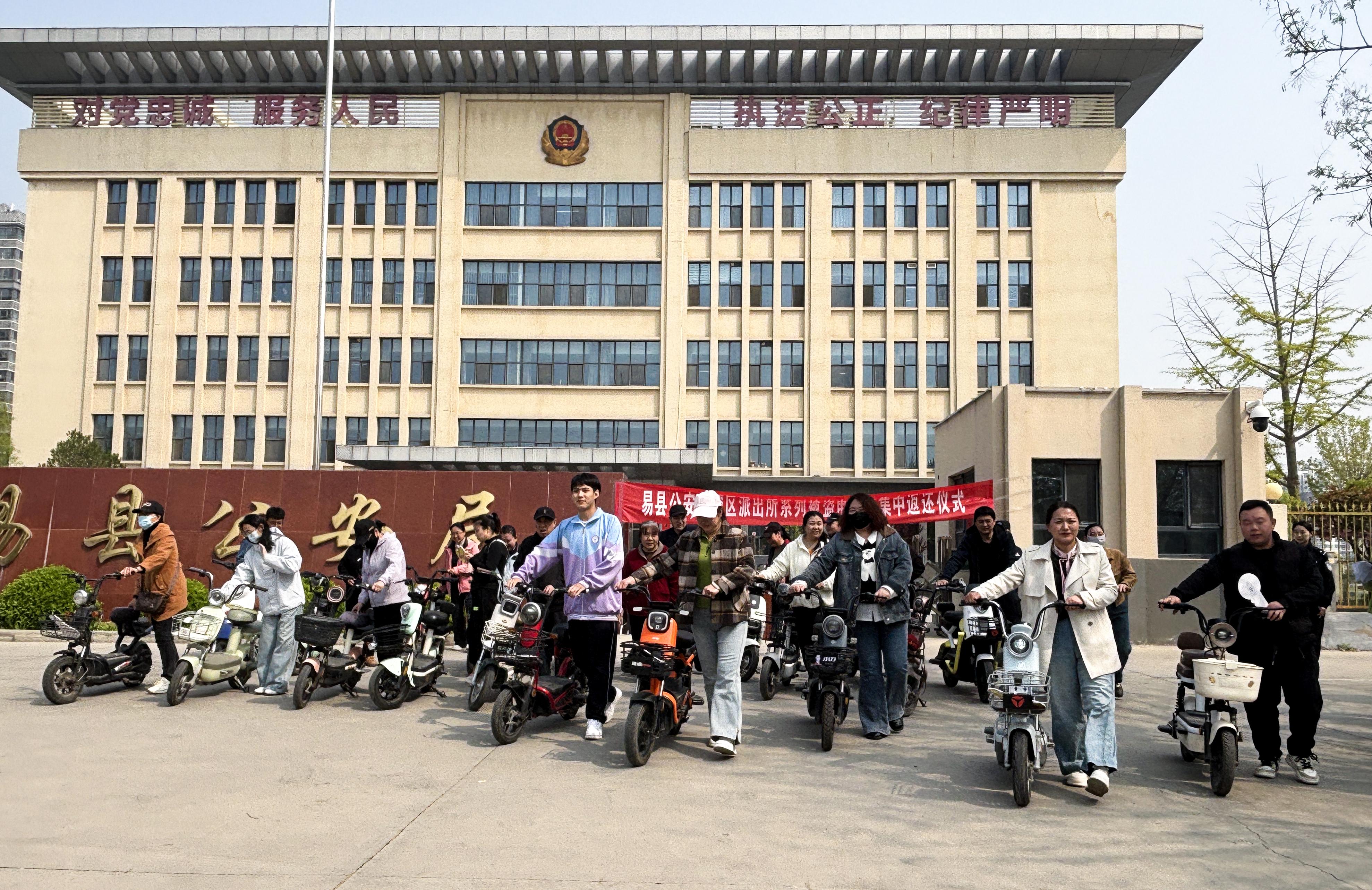 4月15日,河北省保定市易縣公安局舉行涉案電動車集中返還活動,將24輛追回的被盜電動車逐一返還失主?;顒蝇F(xiàn)場,24名車主領(lǐng)回了自己失而復得的電動車,紛紛對民警高效辦案、為民挽損表示感謝。