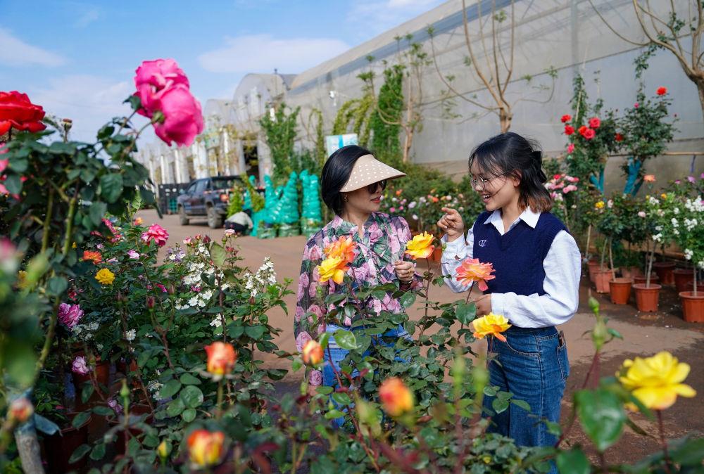 2025年4月11日,越南花商阮翠云(左)與翻譯李青歌在云南昆明斗南一花卉基地內(nèi)查看鮮花品質(zhì)。2018年,阮翠云開始在越南銷售云南花卉,讓七彩“云花”成為眾多越南家庭的“??汀薄=柚咝У碾娚唐脚_和快捷的物流網(wǎng)絡(luò),鮮花從云南花田到河內(nèi)貨架實現(xiàn)了“次日達(dá)”。