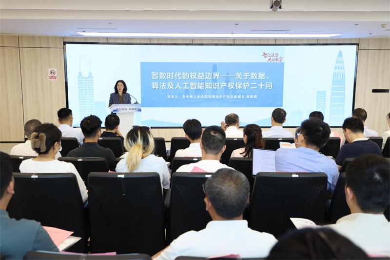 活動伊始,市中級人民法院深圳知識產(chǎn)權(quán)法庭庭長蔣筱熙發(fā)布《智數(shù)時代的權(quán)益邊界——關(guān)于數(shù)據(jù)、算法及人工智能知識產(chǎn)權(quán)保護二十問》(以下簡稱《二十問》)。《二十問》緊扣企業(yè)經(jīng)營和產(chǎn)業(yè)發(fā)展中的數(shù)據(jù)、人工智能相關(guān)痛點,聚焦數(shù)據(jù)抓取合法性、算法商業(yè)秘密保護、AI生成內(nèi)容權(quán)利歸屬等高頻問題,將宏觀法律原則轉(zhuǎn)化為具體實踐指引,為企業(yè)提供“看得懂、用得上”的法律導(dǎo)航,打通立法原則與企業(yè)合規(guī)實踐的“最后一公里”。隨后,深圳知識產(chǎn)權(quán)法庭法官張婷解讀了《二十問》的起草背景與依據(jù),從法理、司法方法、產(chǎn)業(yè)實踐等方面進行系統(tǒng)化闡釋。