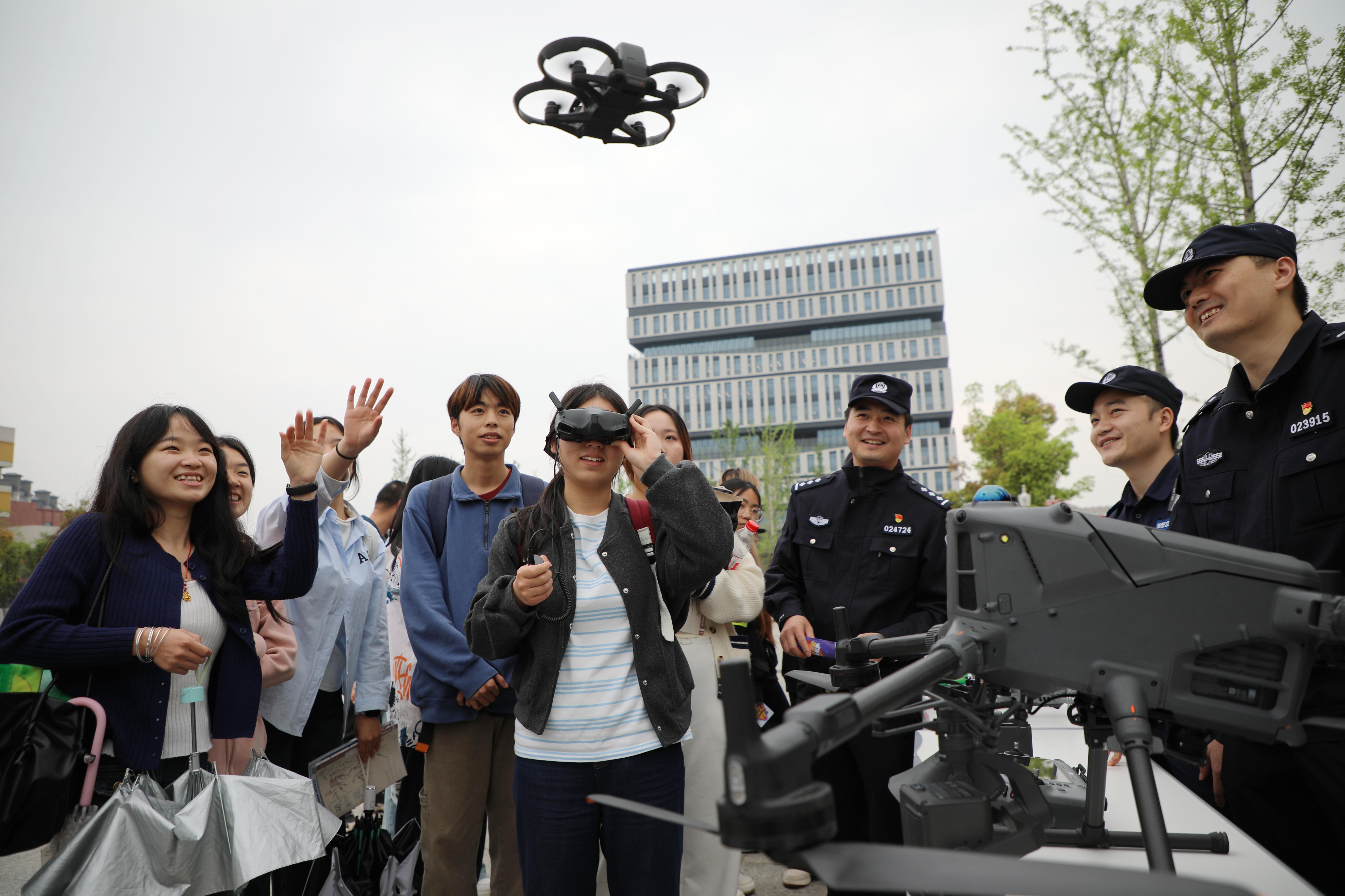 圖為4月15日,民警走進江西財經(jīng)職業(yè)學(xué)院讓學(xué)生體驗無人機等警用裝備。