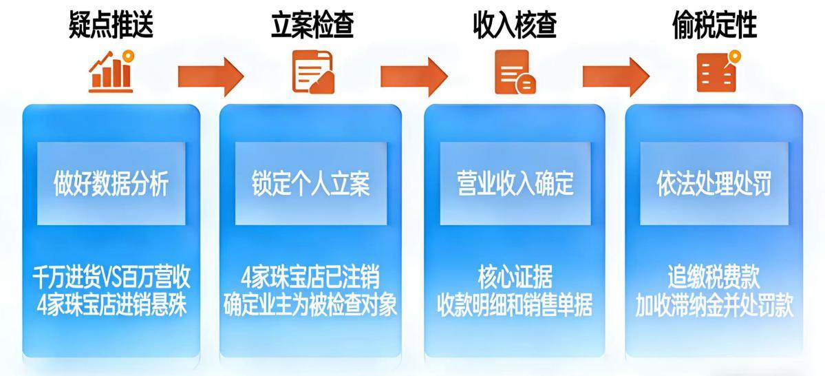 檢查人員依托稅收大數(shù)據(jù)分析,比對該珠寶店的發(fā)票數(shù)據(jù)和自行申報(bào)信息,發(fā)現(xiàn)其2022年至2024年共計(jì)接收上游兩家公司金銀珠寶首飾發(fā)票685份,發(fā)票金額合計(jì)8100.56萬元,但同期申報(bào)的增值稅應(yīng)稅收入僅467.35萬元,消費(fèi)稅應(yīng)稅收入463.86萬元。八千多萬的進(jìn)貨成本,卻只申報(bào)了不到五百萬的銷售收入,有違經(jīng)營常理。