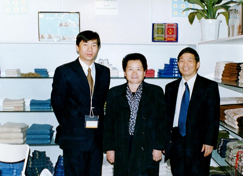 2000年3月北京中國國際紡織品博覽會上,原中國紡織工業(yè)部部長吳文英(中)、原中國家用紡織品協(xié)會會長楊東輝(右)在南華實業(yè)公司展位前與馬濤(左)合影。展位商品所使用的標(biāo)識即為“無印良品”。