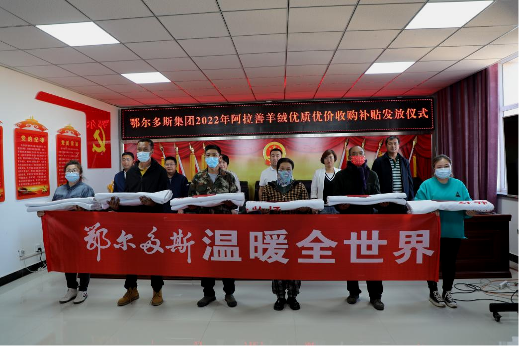 圖為鄂爾多斯集團為牧民發(fā)放羊絨優(yōu)質(zhì)優(yōu)價收購補貼。