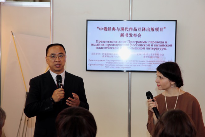 杰尼索夫大使在隨后的致辭中說(shuō):“上周,我和格里高利耶夫夫(俄羅斯出版與大眾傳媒署副署長(zhǎng))剛剛出席在北京俄羅斯文化中心舉辦的《普京:權(quán)力的邏輯》中文版首發(fā)式,今天在莫斯科書(shū)展再次出席非常高興。“中俄互譯出版項(xiàng)目”是兩國(guó)最重要的人文合作項(xiàng)目之一,俄羅斯外交部、俄羅斯大使館都非常支持。我認(rèn)為,中俄兩國(guó)所有領(lǐng)域的合作中最重要的是人文領(lǐng)域,尤其是圖書(shū)出版和文學(xué)翻譯。我作為俄羅斯駐華大使,能親身感受到中國(guó)年輕人對(duì)俄羅斯文學(xué)的濃厚興趣,我也希望,俄羅斯年輕人也能喜歡中國(guó)文學(xué)。俄羅斯文學(xué)的中國(guó)翻譯家和中國(guó)文學(xué)的俄羅斯翻譯家都是偉大的人物,我們應(yīng)該為他們樹(shù)立豐碑,書(shū)展就是這樣的豐碑。希望“中俄互譯出版項(xiàng)目”今后能夠出版200部、300部甚至更多的成果!”
