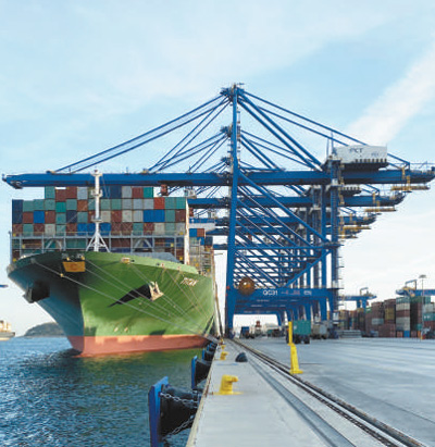 11月6日,一艘貨輪在中遠海運比雷埃夫斯港集裝箱3號碼頭裝卸貨物。 本報記者 韓秉宸攝