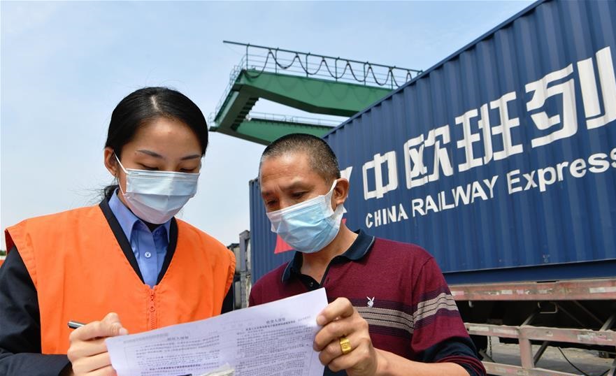 4月25日,中國(guó)鐵路南昌局集團(tuán)有限公司海滄站貨運(yùn)員李瑩(左)在廈門海滄站和發(fā)貨方代表辦理中歐班列貨物進(jìn)站交接手續(xù)。 當(dāng)日,中歐班列X8098次貨物列車從福建廈門海滄站出發(fā),開往德國(guó)漢堡。這趟中歐班列搭載50個(gè)40尺標(biāo)準(zhǔn)集裝箱,裝有一次性防疫口罩、簡(jiǎn)易呼吸器、輸液器、防護(hù)服等約468萬件防疫物資,以及服裝、電子產(chǎn)品等貨物。 據(jù)中國(guó)鐵路南昌局集團(tuán)有限公司數(shù)據(jù)統(tǒng)計(jì),2020年第一季度,漳州車務(wù)段海滄站已累計(jì)開行中歐班列66列,裝車3014輛,貨物價(jià)值約2億美元;與2019年同期相比,開行列數(shù)增長(zhǎng)88%,裝運(yùn)量增長(zhǎng)196%,運(yùn)輸收入增長(zhǎng)219%。 新華社記者 魏培全 攝