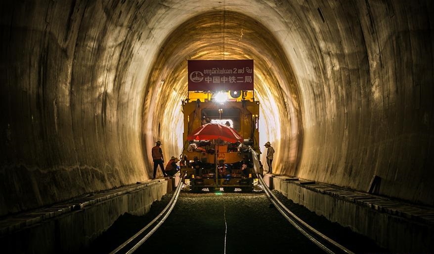 5月23日,在老撾萬象省庚凱村隧道的中老鐵路施工現(xiàn)場,中老兩國工人協(xié)力鋪軌。 隨著每排14根軌枕按照規(guī)定距離平穩(wěn)鋪過庚凱村隧道,500米長鋼軌隨著牽引機穩(wěn)準落定,中老鐵路鋪軌23日通過第一座隧道,從老撾首都萬象一路向北。 新華社發(fā)(凱喬攝)