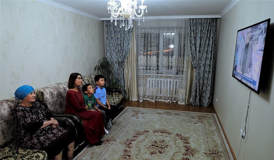 10月9日,在哈薩克斯坦努爾蘇丹,當?shù)鼐用裨诩抑杏^看“一帶一路”紀錄片《你好,哈薩克斯坦》。