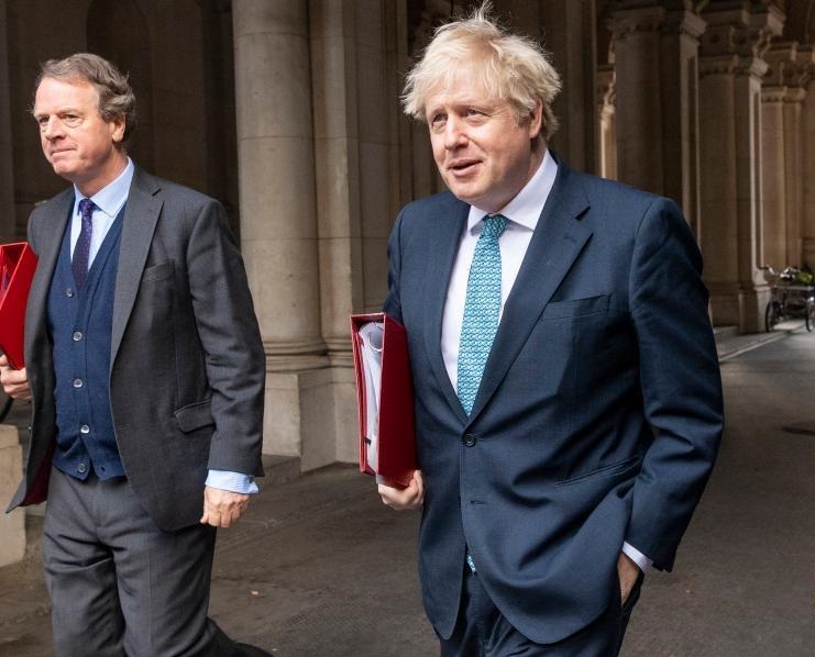 12月15日,在英國(guó)倫敦,英國(guó)首相鮑里斯·約翰遜(左二)參加完內(nèi)閣會(huì)議后返回首相府。
