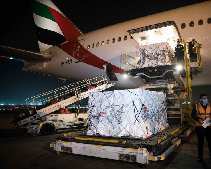 12月10日,在埃及開羅國際機場,工作人員運輸中國研制生產(chǎn)的新冠疫苗。新華社記者鄔惠我攝