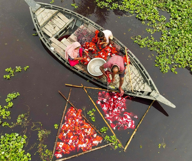 人民網(wǎng)訊 當(dāng)?shù)貢r間2021年1月10日,孟加拉國Araihazar,實拍印染廠織布晾曬過程。