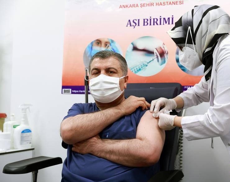 1月13日,土耳其衛(wèi)生部長科賈(左)在安卡拉接種中國新冠疫苗。土耳其衛(wèi)生部長科賈13日接種中國科興公司研發(fā)的新冠疫苗,并向民眾進(jìn)行了現(xiàn)場電視直播。同時接種中國疫苗的還有土耳其應(yīng)對新冠疫情科學(xué)委員會成員。(新華社發(fā))