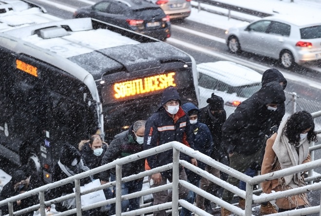 當(dāng)?shù)貢r(shí)間2月17日,土耳其伊斯坦布爾,人們戴著口罩行走在大雪中。(圖片來源:東方IC)