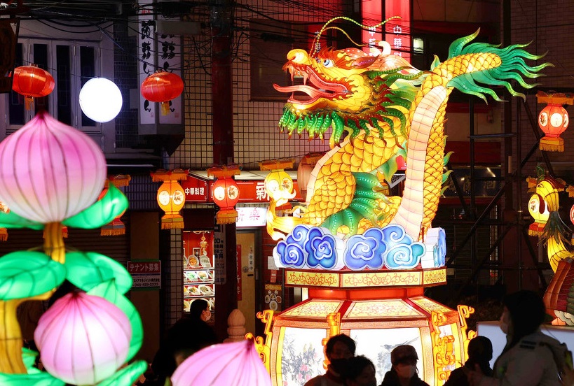 人民網(wǎng)訊 當(dāng)?shù)貢r(shí)間2月13日,為慶祝中國農(nóng)歷新年,日本橫濱中華街展出以中國文化為主題的花燈,為當(dāng)?shù)貛硇麓旱南矐c氣息。