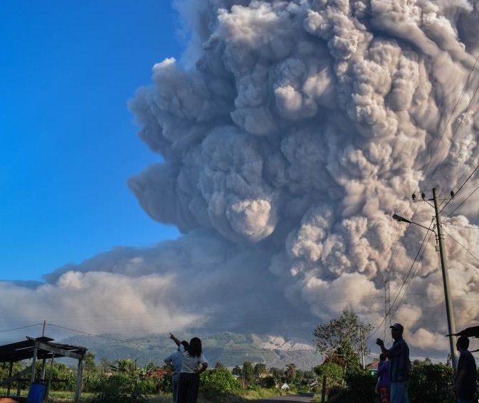 3月2日,人們在印度尼西亞北蘇門答臘省卡羅觀看噴發(fā)的錫納朋火山。新華社發(fā)(森比林攝)