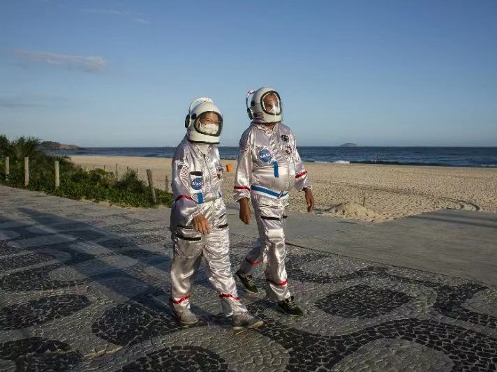 人民網(wǎng)訊 當(dāng)?shù)貢r間2021年3月20日,巴西里約熱內(nèi)盧,Tercio Galdino與妻子Alicea著太空服裝扮出行伊帕尼瑪海灘,在保護自己免受新冠感染的同時呼吁民眾加強防疫。