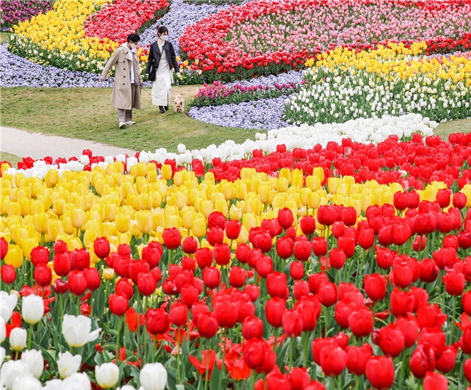 人民網(wǎng)訊 當(dāng)?shù)貢r間4月6日,日本兵庫縣淡路市,市民在國家公園郁金香花海中欣賞風(fēng)景。